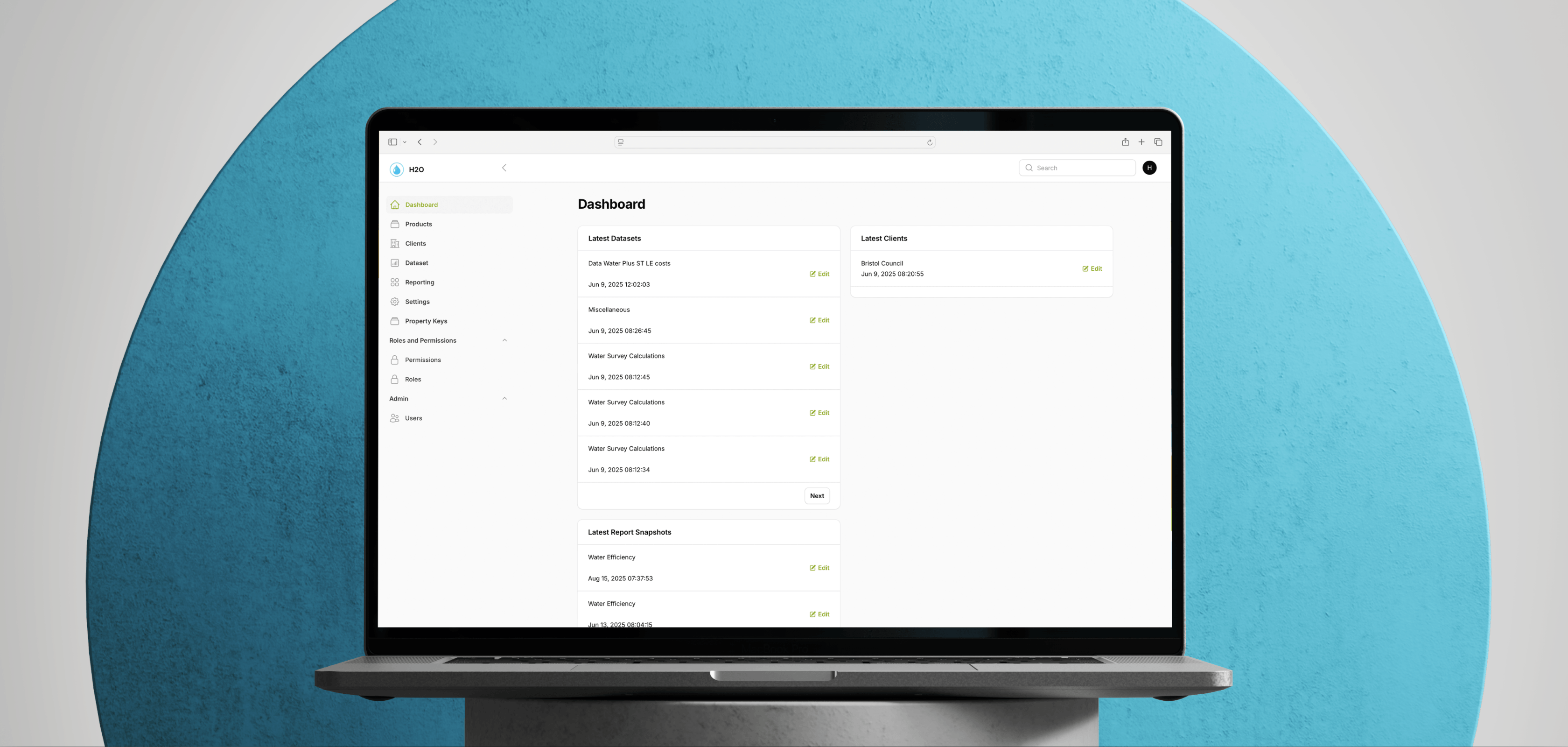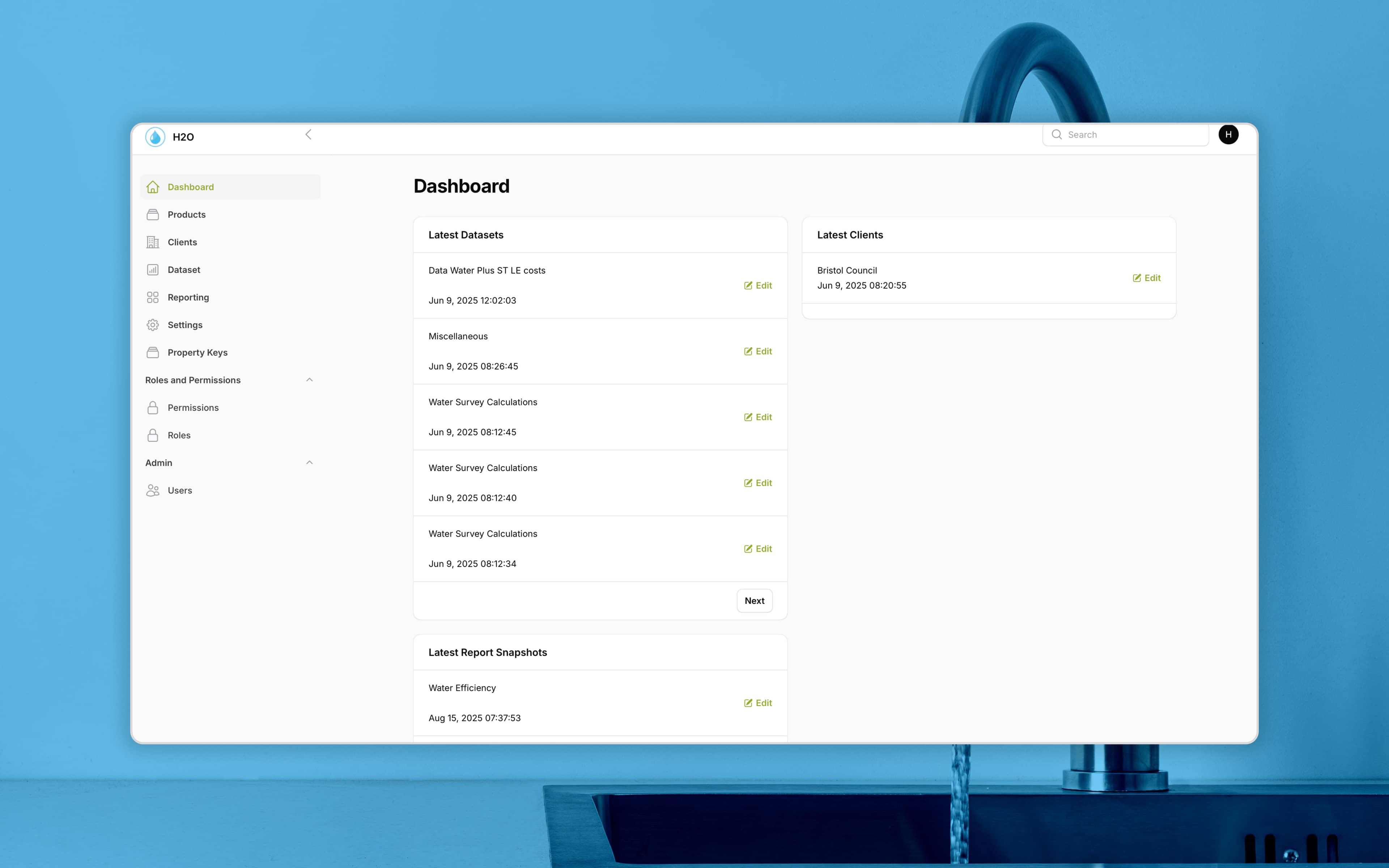 To streamline operations and lay the groundwork for a future commercial offering, H2OiQ needed a platform that could automate the reporting process, structure their data, and provide better visibility across client engagements. This meant importing data from existing systems, managing complex cascading calculations, and generating custom, professional-grade PDF reports, all from a unified, intelligent backend.
