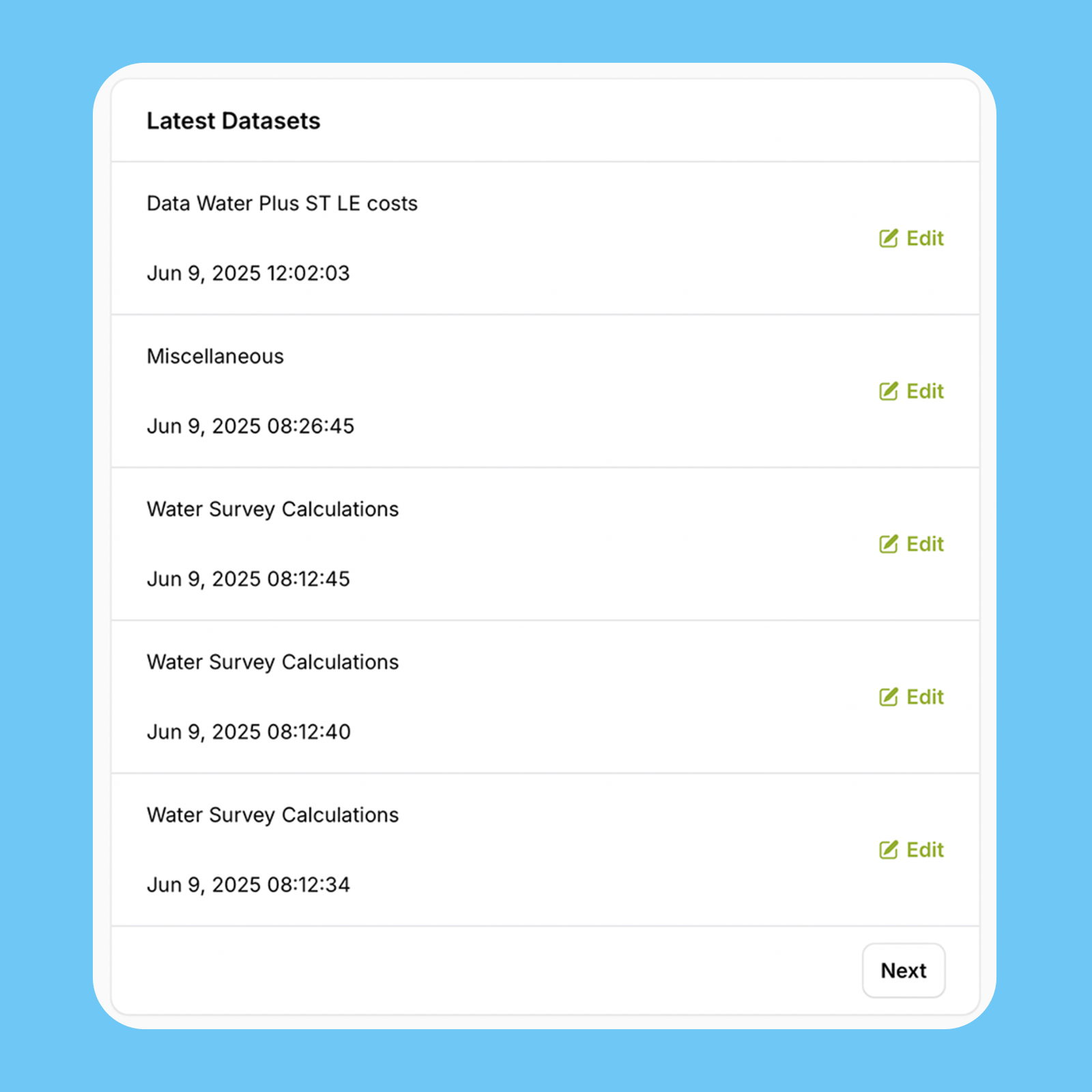The system connects directly with H2OiQ’s existing third-party software platform (Configure), importing raw data collected during on-site surveys. This live link ensures that all calculations and outputs are grounded in the most up-to-date information, removing the need for manual exports and uploads. - Intelligent Calculation Engine: