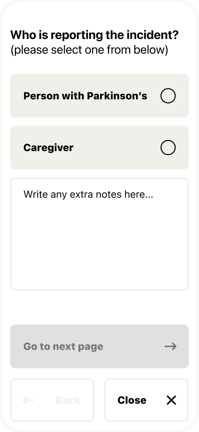 For people living with Parkinson’s, the app creates a simple way to track their own patterns, communicate with caregivers, and feel more in control of their condition. The interface is built for real-world use, not just academic insight — and supports users with varying tech confidence and accessibility needs.