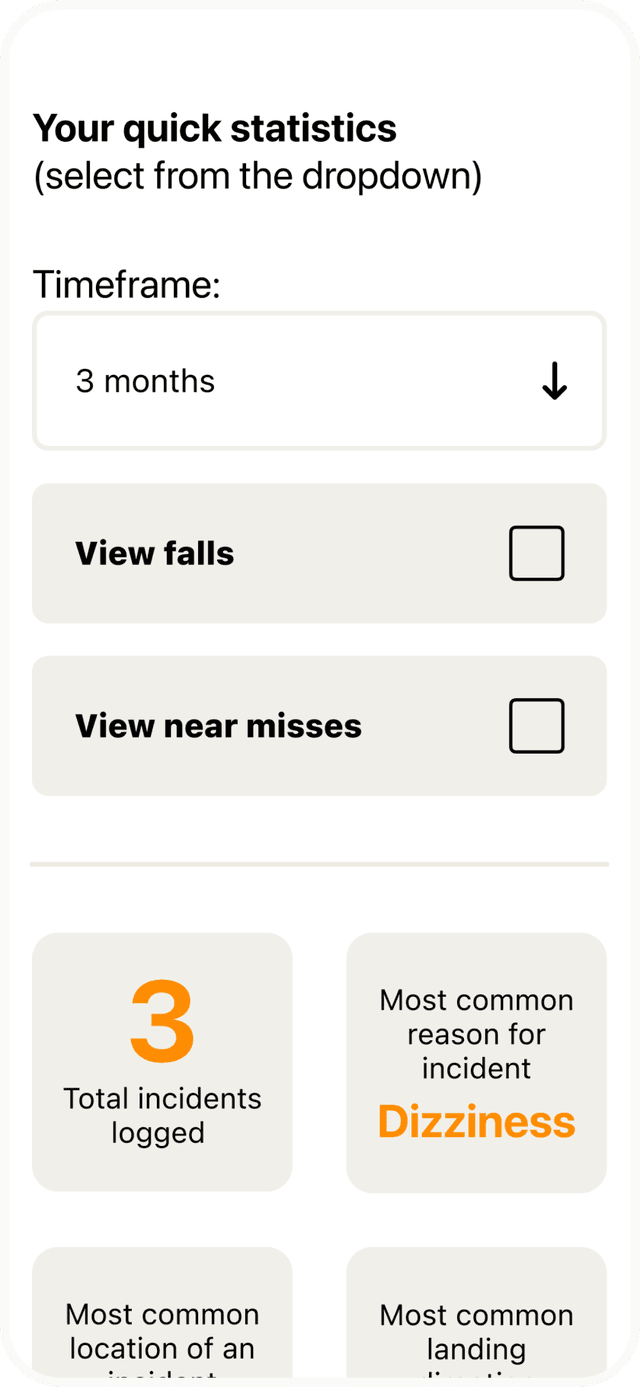 The goal was clear: a mobile app that’s easy to use, medically valuable, and empowering for patients and caregivers — without overwhelming them with complexity. Achieving that meant addressing several challenges: making fall reporting quick, intuitive, and non-intrusive; designing for multiple user types including patients, carers, and professionals; capturing clinically useful data while protecting privacy; and providing meaningful summaries and insights within the app itself.